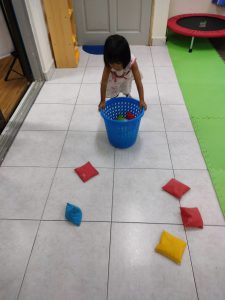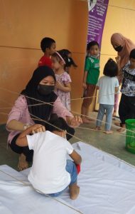 Anda boleh gunakan benang kait atau benang yang tebal untuk membuat laluang berhalangan dan tambah sepit atau magnet huruf untuk di gantung pada laluan berhalangan. Permainanan ini akan membolehkan kanak-kanak menggunakan kemahiran menyelesaikan masalah semasa mereka mengharungi laluan berhalangan. Mereka perlu meregangkan, melangkah, merangkak, dan mungkin juga memanjat untuk mengumpul semua huruf atau sepit yang tergantung pada tali.