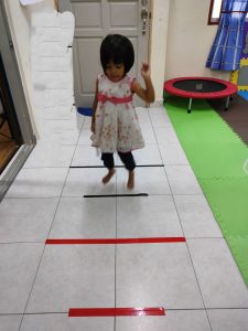 Anda boleh menggunakan kapur, tali atau pita pelekat untuk mencipta garisan yang boleh digunakan oleh kanak-kanak untuk melompat. Buat peraturan mudah tentang cara melompat, seperti dengan satu atau dua kaki. Atau melompat terus dua garisan dan berhenti. Kanak-kanak akan belajar bagaimana untuk berhenti dan melompat, dan menunggu giliran mereka.